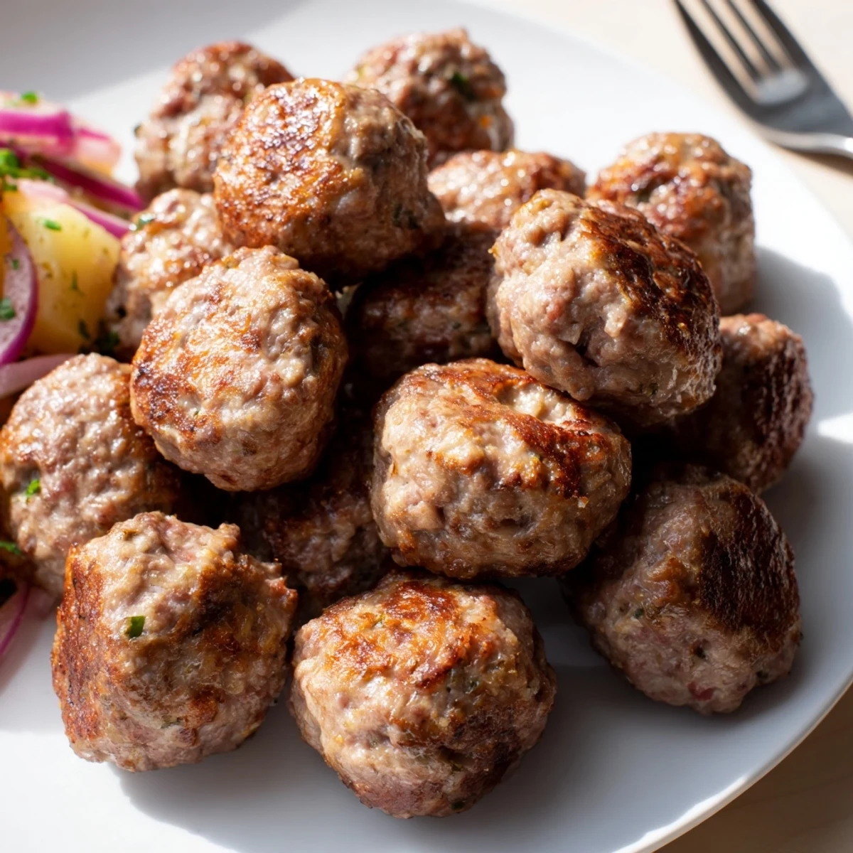 Merken Saftige, goldbraune Fleischklöße serviert mit einem cremigen, würzigen Kartoffelsalat — ein klassisches Wohlfühlessen, perfekt für Familienessen oder lockere Zusammenkünfte.