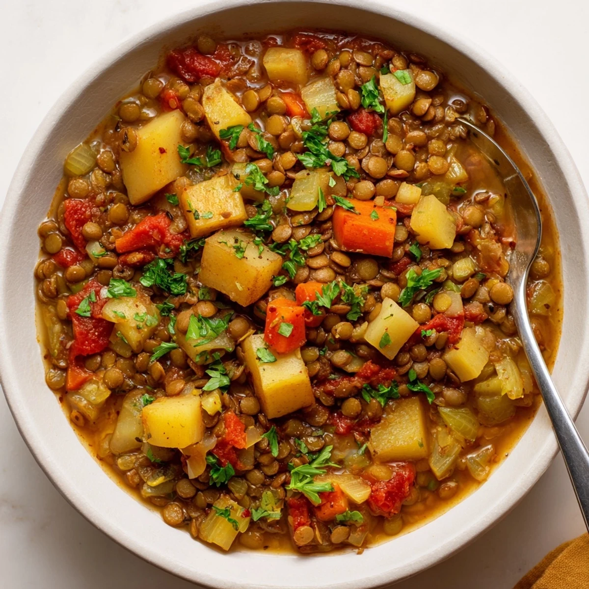 Merken Ein herzhaftes, tröstendes Eintopfgericht mit zarten Linsen, die mit aromatischem Gemüse und wärmenden Gewürzen gekocht werden. Perfekt für kalte Abende und reich an pflanzlichem Eiweiß.